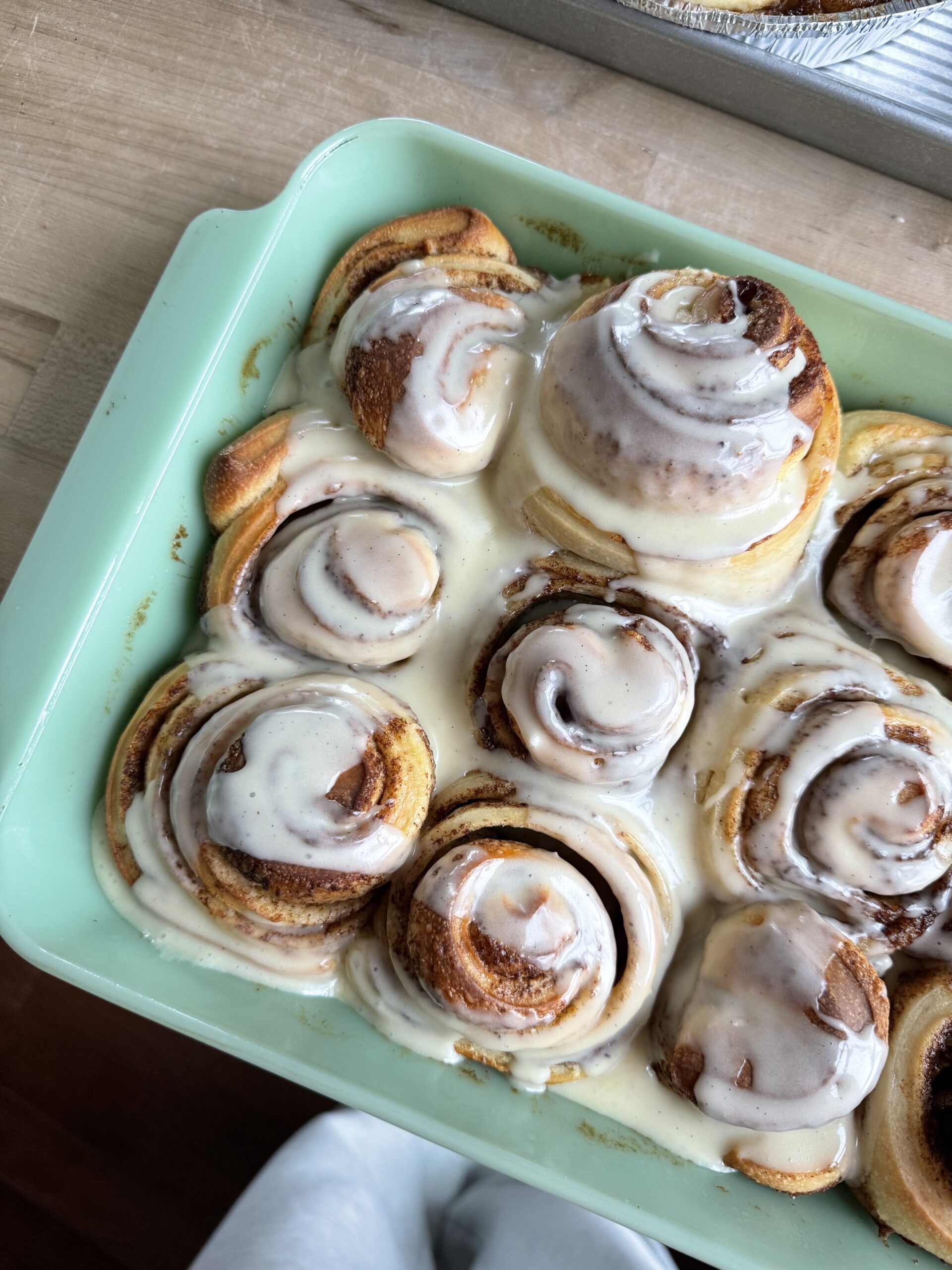 - After the rolls have cooled for a bit, frost them generously. Enjoy!
