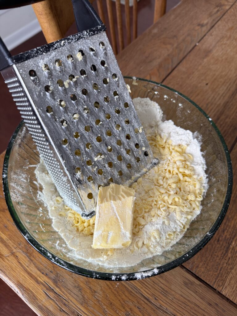 - Grate the frozen butter into the flour. (Pro tip: Coat the stick of butter in the flour mixture before grating. This will make it easier to hold!)