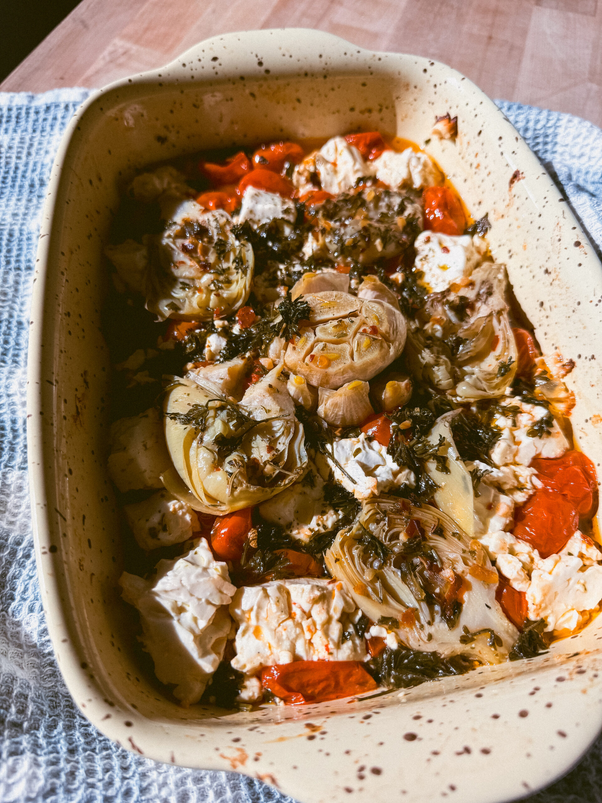 There is a certain kind of dish that hits the table and immediately makes every other option irrelevant. This is that dish. A casserole of cherry tomatoes, artichoke hearts, and broken feta goes into the oven covered, and what comes out an hour later is something that barely resembles what went in. The tomatoes have collapsed into a jammy, concentrated sauce. The feta has softened into creamy pockets that run into every gap. The garlic, roasted whole and slow, squeezes out sweet and almost buttery and folds into the whole thing like it was always supposed to be there.